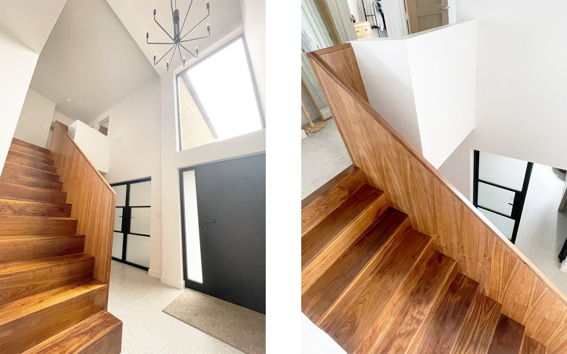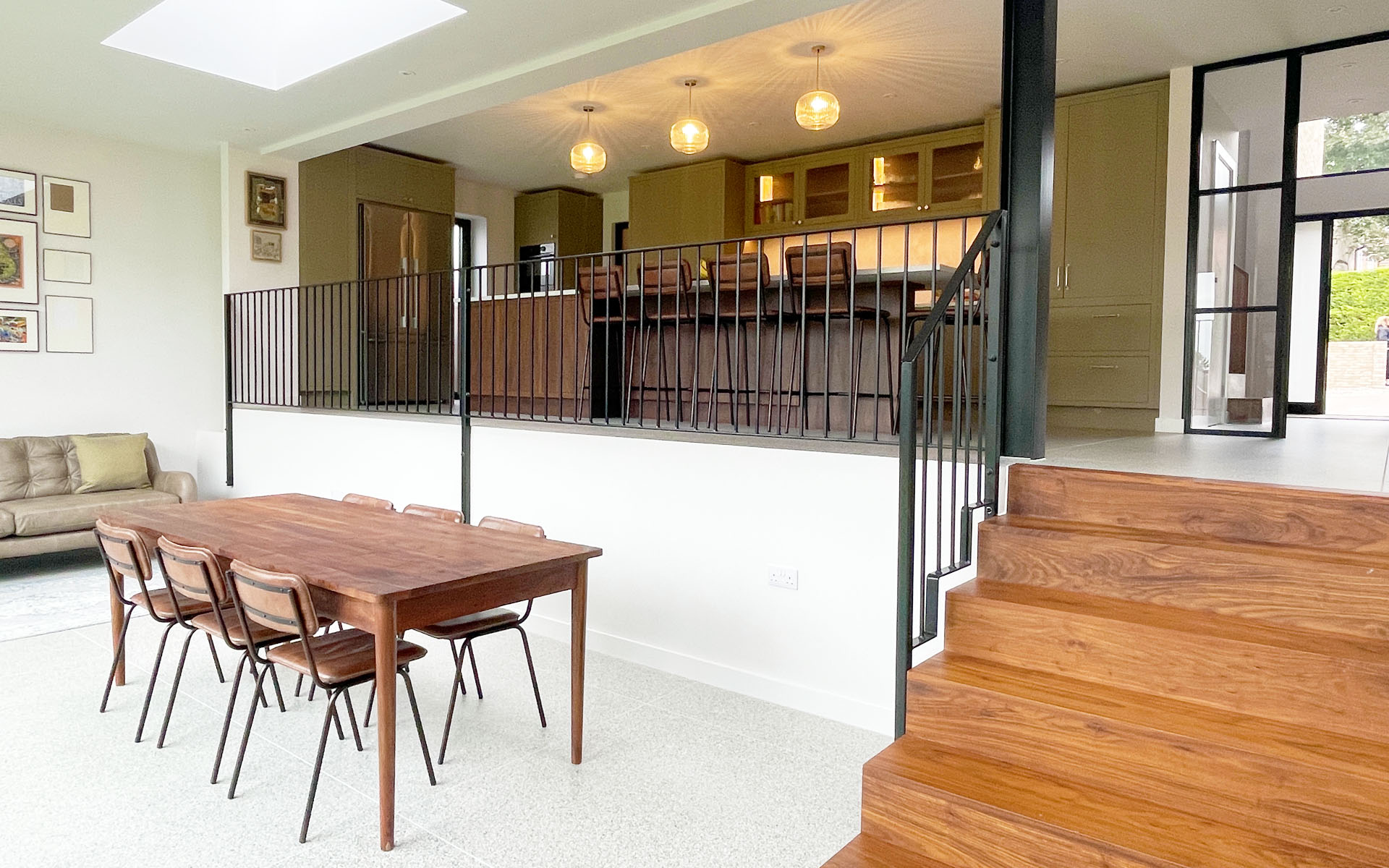 Significantly, internally, we reimagined the layout to create a dynamic and cohesive flow. We moved the staircase to a double-height hallway, introducing light and spatial drama to the home’s heart. A split-level, open-plan rear connects the kitchen and new extension to the garden, providing a seamless indoor–outdoor link.